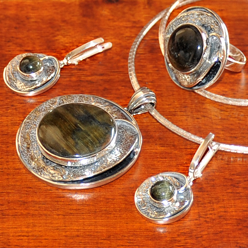 СРЕБЪРЕН КОМПЛЕКТ СЪС СОКОЛОВО ОКО, РЪЧНА ИЗРАБОТКА, СЪСТОЯЩ СЕ ОТ МЕДАЛЬОН, ПРЪСТЕН И ОБЕЦИ.