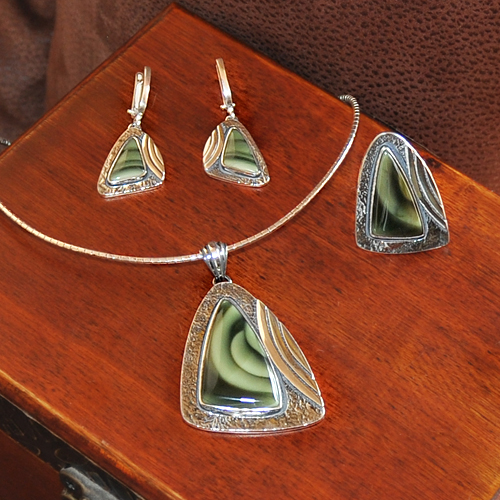 СРЕБЪРЕН КОМПЛЕКТ С УНИКАЛЕН РЕЙНБОУ ИМПЕРИАЛ ЯСПИС, РЪЧНА ИЗРАБОТКА, СЪСТОЯЩ СЕ ОТ МЕДАЛЬОН, ПРЪСТЕН И ОБЕЦИ.