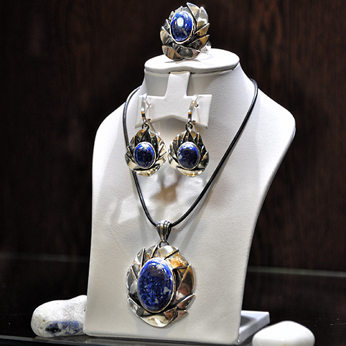 ОПИСАНИЕ: СРЕБЪРЕН КОМПЛЕКТ С ЛАЗУРИТ, РЪЧНА ИЗРАБОТКА, СЪСТОЯЩ СЕ ОТ МЕДАЛЬОН, ПРЪСТЕН И ОБЕЦИ.