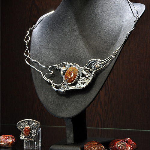 СРЕБЪРЕН КОМПЛЕКТ С ЯСПИС, РЪЧНА ИЗРАБОТКА, СЪСТОЯЩ СЕ ОТ КОЛИЕ И ПРЪСТЕН.