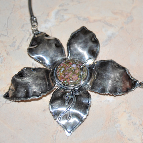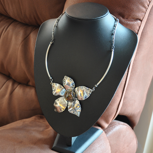 СРЕБЪРНО КОЛИЕ – ЦВЕТЕ, С ИНКРУСТИРАН ЯСПИС, РЪЧНА ИЗРАБОТКА.ГОЛЕМИНА НА КАМЪКА – 20 мм., ГОЛЕМИНА НА ЦВЕТЕТО – 8/8.5 см