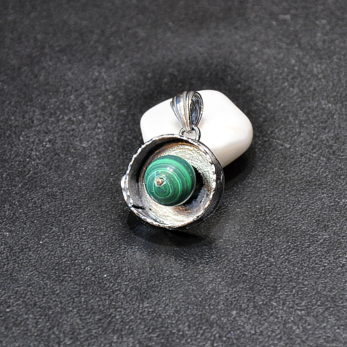 СРЕБЪРЕН МЕДАЛЬОН С МАЛАХИТ/СФЕРА/, РЪЧНА ИЗРАБОТКА.ДИАМЕТЪР НА КАМЪКА – 12 мм., ДИАМЕТЪР НА МЕДАЛЬОНА – 2.1 см., ВИСОЧИНА – 0.7см.