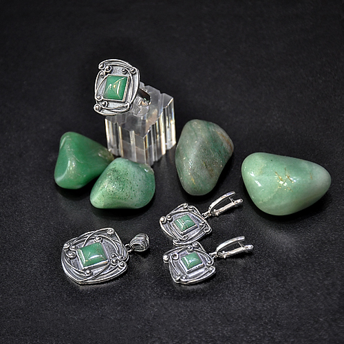 СРЕБЪРЕН КОМПЛЕКТ С АВАНТЮРИН, РЪЧНА ИЗРАБОТКА, СЪСТОЯЩ СЕ ОТ МЕДАЛЬОН, ПРЪСТЕН И ОБЕЦИ.