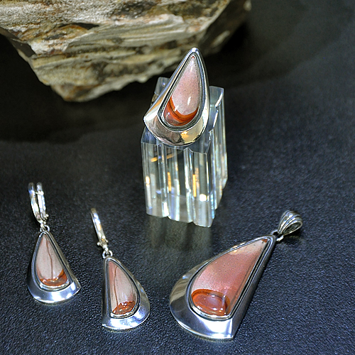 СРЕБЪРЕН КОМПЛЕКТ - УНИКАТ, С МОКАИТ /АВСТРАЛИЙСКИ ЯСПИС/, РЪЧНА ИЗРАБОТКА, СЪСТОЯЩ СЕ ОТ МЕДАЛЬОН, ПРЪСТЕН И ОБЕЦИ.