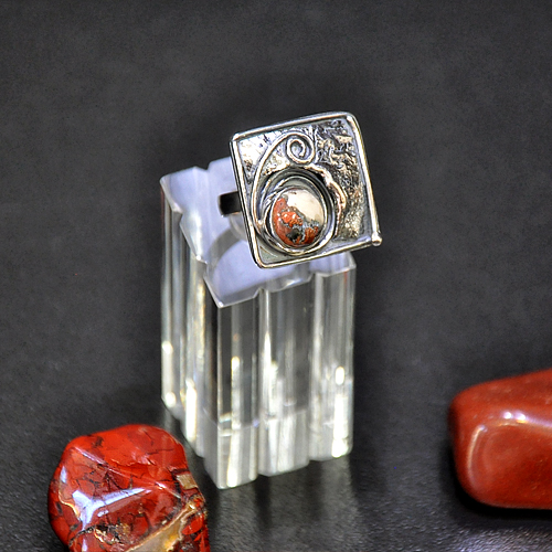 СРЕБЪРЕН ПРЪСТЕН – УНИКАТ С ЯСПИС „БРЕКЧА“, РЪЧНА ИЗРАБОТКА.ГОЛЕМИНА НА ПРЪСТЕНА – 2.2/2.2 см., НА КАМЪКА 9 мм.РАЗМЕР НА ПРЪСТЕНА 54, КОРИГИРАЩА ХАЛКА.