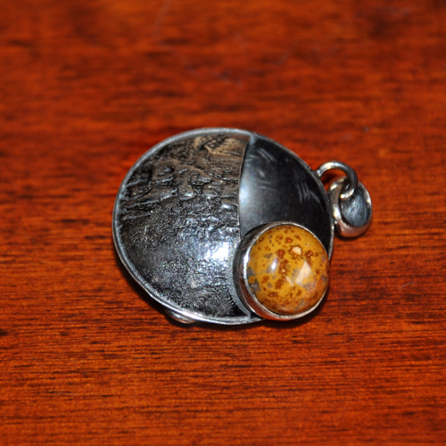 СРЕБЪРЕН МЕДАЛЬОН С ЖЪЛТ ЯСПИС , РЪЧНА ИЗРАБОТКА.ГОЛЕМИНА НА КАМЪКА – 9 мм., ДИАМЕТЪР НА МЕДАЛЬОНА –2.5 см.
