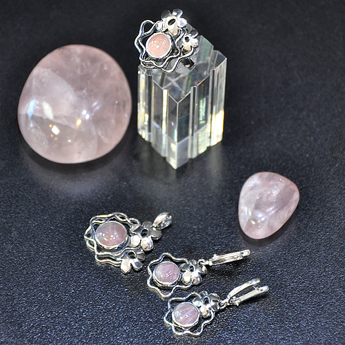СРЕБЪРЕН КОМПЛЕКТ С РОЗОВ КВАРЦ, РЪЧНА ИЗРАБОТКА, СЪСТОЯЩ СЕ ОТ МЕДАЛЬОН, ПРЪСТЕН И ОБЕЦИ.