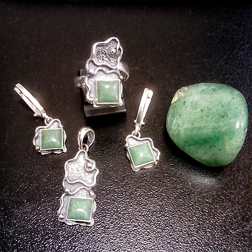 СРЕБЪРЕН КОМПЛЕКТ С АВАНТЮРИН, РЪЧНА ИЗРАБОТКА, СЪСТОЯЩ СЕ ОТ МЕДАЛЬОН, ПРЪСТЕН И ОБЕЦИ.