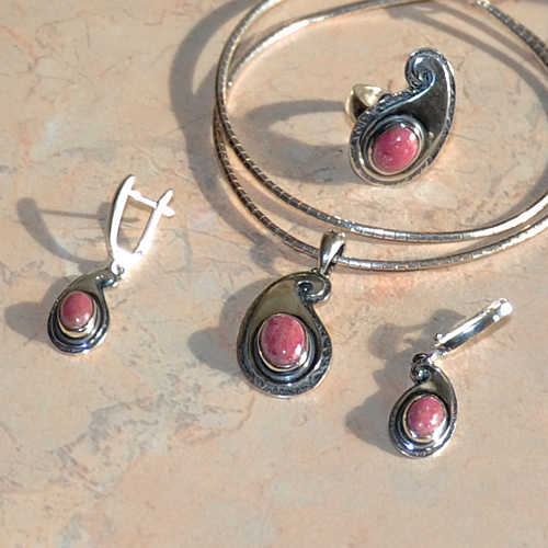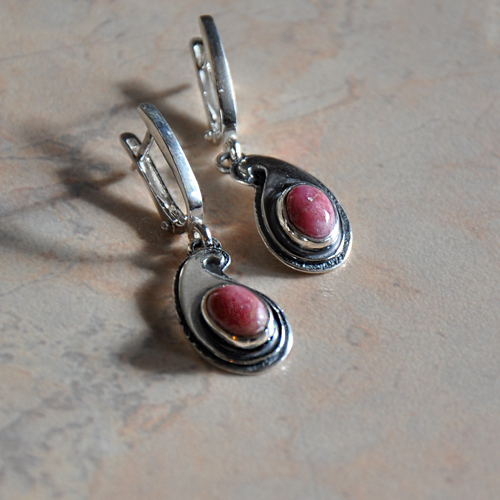 СРЕБЪРНИ ОБЕЦИ С РОДОНИТ, РЪЧНА ИЗРАБОТКА.ГОЛЕМИНА НА КАМЪКА – 7/5 мм., ГОЛЕМИНА НА ОБЕЦАТА 1.8/1 см. АНГЛИЙСКО ЗАКОПЧАВАНЕ.