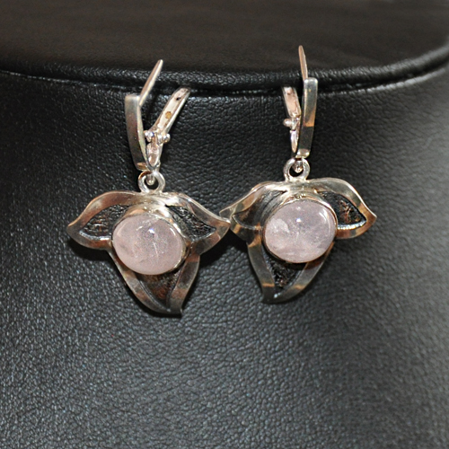 СРЕБЪРНИ ОБЕЦИ С РОЗОВ КВАРЦ, РЪЧНА ИЗРАБОТКА.ГОЛЕМИНА НА КАМЪКА – 9 мм., ГОЛЕМИНА НА ОБЕЦАТА 3.8/2.2 см. АНГЛИЙСКО ЗАКОПЧАВАНЕ.