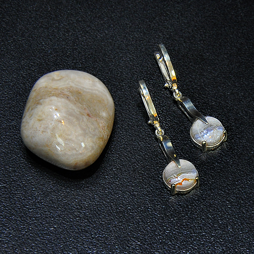 СРЕБЪРНИ ОБЕЦИ С АХАТ „БЛУЛЕЙС“.ДИАМЕТЪР НА КАМЪКА – 9мм., ДЪЛЖИНА НА ОБЕЦАТА – 4 см.АНГЛИЙСКО ЗАКОПЧАВАНЕ.