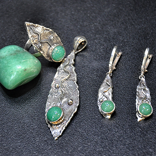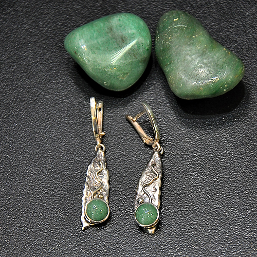 СРЕБЪРНИ ОБЕЦИ „ЛИСТ“ СЪС ЗЕЛЕН АВАНТЮРИН, РЪЧНА ИЗРАБОТКА.ДИАМЕТЪР НА КАМЪКА – 7 мм, ГОЛЕМИНА НА ОБЕЦАТА – 4.7/0.8 см.АНГЛИЙСКО ЗАКОПЧАВАНЕ.