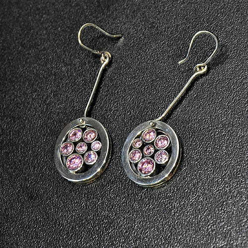 СРЕБЪРНИ ОБЕЦИ С РОЗОВИ ЦИРКОНИ, РЪЧНА ИЗРАБОТКА.ДИАМЕТЪР НА НАЙ-ГОЛЕМИЯ КАМЪК – 5 мм., ДИАМЕТЪР НА НАЙ-МАЛКИЯ КАМЪК – 3 мм.,ГОЛЕМИНА НА ОБЕЦАТА 2.3/2.1 см., ДЪЛЖИНА - 5 см.