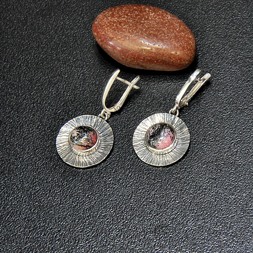 СРЕБЪРНИ ОБЕЦИ С РОДОНИТ, РЪЧНА ИЗРАБОТКА.ДИАМЕТЪР НА ОБЕЦАТА – 1.9 см., НА КАМЪКА - 9 мм.АНГЛИЙСКО ЗАКОПЧАВАНЕ.