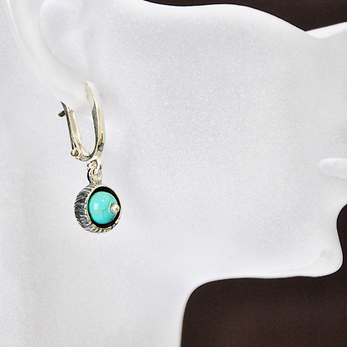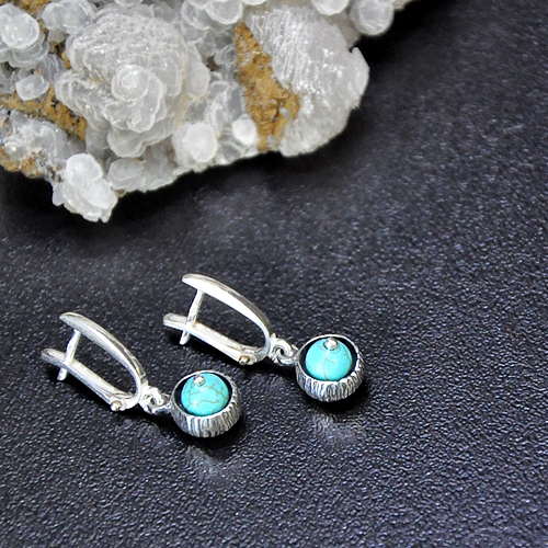 СРЕБЪРНИ ОБЕЦИ С ТЮРКОАЗ, РЪЧНА ИЗРАБОТКА.ДИАМЕТЪР НА ОБЕЦАТА – 0.8 см.. НА КАМЪКА – 5 мм.АНГЛИЙСКО ЗАКОПЧАВАНЕ.