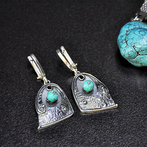 СРЕБЪРНИ ОБЕЦИ С КАМЪК СФЕРИЧЕН ТЮРКОАЗ, РЪЧНА ИЗРАБОТКА