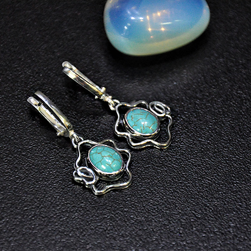 СРЕБЪРНИ ОБЕЦИ С ТЮРКОАЗ, РЪЧНА ИЗРАБОТКА.ГОЛЕМИНА НА КАМЪКА – 9/7 мм., ГОЛЕМИНА НА ОБЕЦАТА 1.7/1.5 см.АНГЛИЙСКО ЗАКОПЧАВАНЕ.