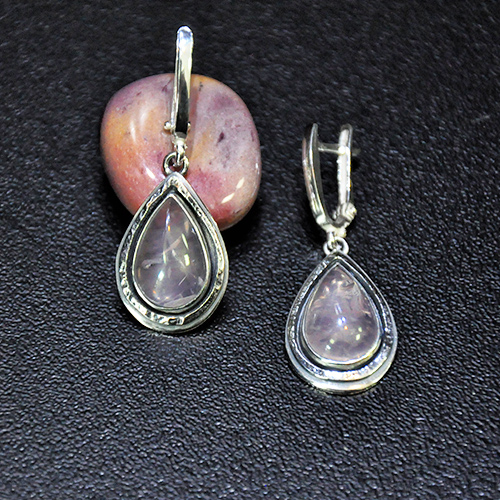 СРЕБЪРНИ ОБЕЦИ С РОЗОВ КВАРЦ, РЪЧНА ИЗРАБОТКА.ГОЛЕМИНА НА ОБЕЦАТА 2.1/1.5 см., ГОЛЕМИНА НА КАМЪКА – 14/10 мм.АНГЛИЙСКО ЗАКОПЧАВАНЕ.