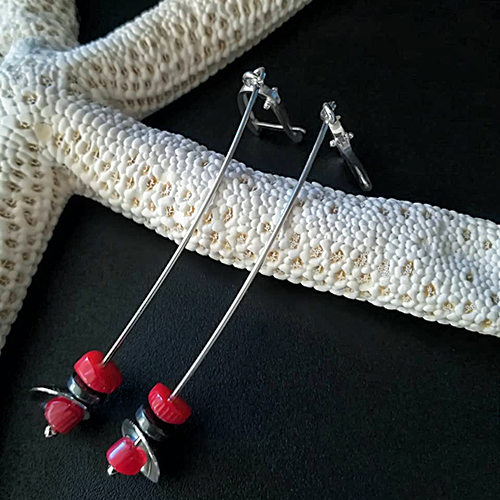 СРЕБЪРНИ ОБИЦИ С ЧЕРВЕН КОРАЛ И ХЕМАТИТ, РЪЧНА ИЗРАБОТКА. ДЪЛЖИНА 6.5 см. АНГЛИЙСКО ЗАКОПЧАВАНЕ.