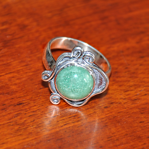 СРЕБЪРЕН ПРЪСТЕН С АВАНТЮРИН, РЪЧНА ИЗРАБОТКА.ГОЛЕМИНА НА КАМЪКА – 10 мм., ГОЛЕМИНА НА ПРЪСТЕНА 1.7/1.2 см., РАЗМЕР НА ПРЪСТЕНА 52.ЗАБЕЛЕЖКА: ПРЪСТЕНЪТ Е С ПОДВИЖНА ВРЪЗКА ПОЗВОЛЯВАЩА РАЗШИРЯВАНЕТО МУ С ДО ДВА РАЗМЕРА!