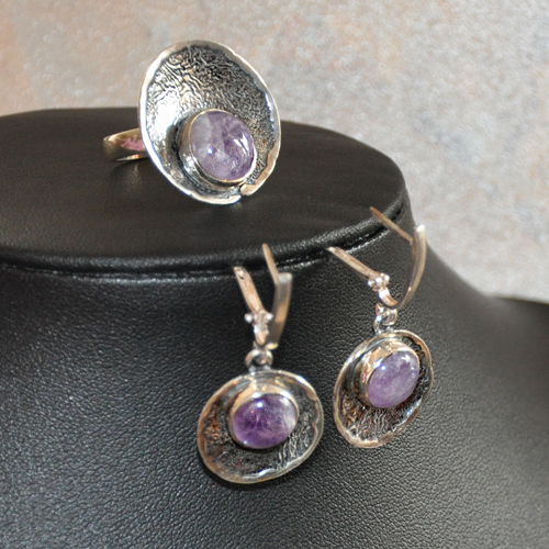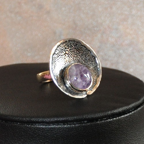 СРЕБЪРЕН ПРЪСТЕН С АМЕТИСТ, РЪЧНА ИЗРАБОТКА.ГОЛЕМИНА НА КАМЪКА – 11 мм., ДИАМЕТЪР НА ПРЪСТЕНА 2.4 см., РАЗМЕР НА ПРЪСТЕНА 54, КОРИГИРАЩА ХАЛКА.