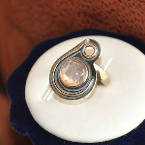 СРЕБЪРЕН ПРЪСТЕН С РОЗОВ КВАРЦ, РЪЧНА ИЗРАБОТКА.ГОЛЕМИНА НА КАМЪКА – 9 мм., ГОЛЕМИНА НА ПРЪСТЕНА 2.2/1.6 см., РАЗМЕР НА ПРЪСТЕНА 48.ЗАБЕЛЕЖКА: ПРЪСТЕНЪТ Е С ПОДВИЖНА ВРЪЗКА ПОЗВОЛЯВАЩА РАЗШИРЯВАНЕТО МУ С ДО ДВА РАЗМЕРА!