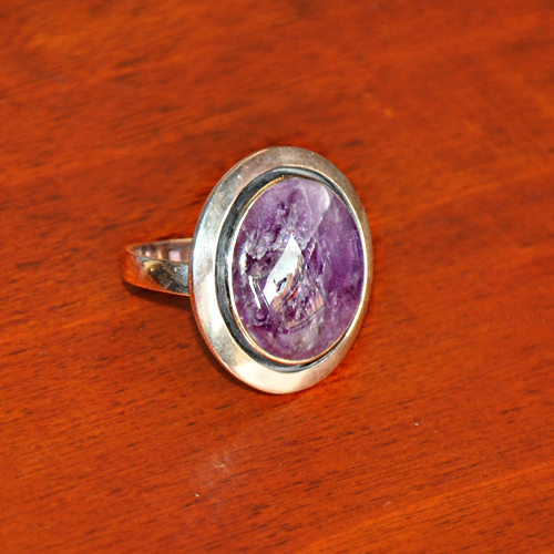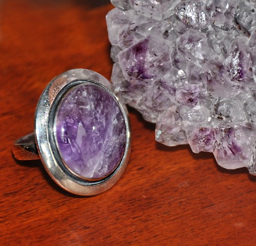 СРЕБЪРЕН ПРЪСТЕН С АМЕТИСТ, РЪЧНА ИЗРАБОТКА.ГОЛЕМИНА НА КАМЪКА – 20 мм., ДИАМЕТЪР НА ПРЪСТЕНА 2.6 см., РАЗМЕР НА ПРЪСТЕНА 54.ЗАБЕЛЕЖКА: ПРЪСТЕНЪТ Е С ПОДВИЖНА ВРЪЗКА ПОЗВОЛЯВАЩА РАЗШИРЯВАНЕТО МУ С ДО ДВА РАЗМЕРА!