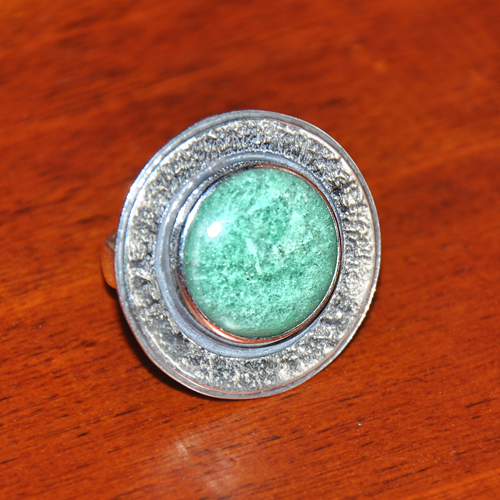 СРЕБЪРЕН ПРЪСТЕН С АВАНТЮРИН, РЪЧНА ИЗРАБОТКА.ГОЛЕМИНА НА КАМЪКА – 15 мм., ДИАМЕТЪР НА ПРЪСТЕНА 2.5 см., РАЗМЕР НА ПРЪСТЕНА 54.ЗАБЕЛЕЖКА: ПРЪСТЕНЪТ Е С ПОДВИЖНА ВРЪЗКА ПОЗВОЛЯВАЩА РАЗШИРЯВАНЕТО МУ С ДО ДВА РАЗМЕРА!