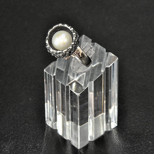 СРЕБЪРЕН ПРЪСТЕН С РЕЧНА ПЕРЛА, В ОБЕМНА ФОРМА.ГОЛЕМИНА НА ПЕРЛАТА – 9 мм., ДИАМЕТЪР НА ПРЪСТЕНА – 1.4 см.ВИСОЧИНА – 0.9 см.РАЗМЕР НА ПРЪСТЕНА 56, КОРИГИРАЩА ХАЛКА.МОДЕЛЪТ Е СЕРИЕН.