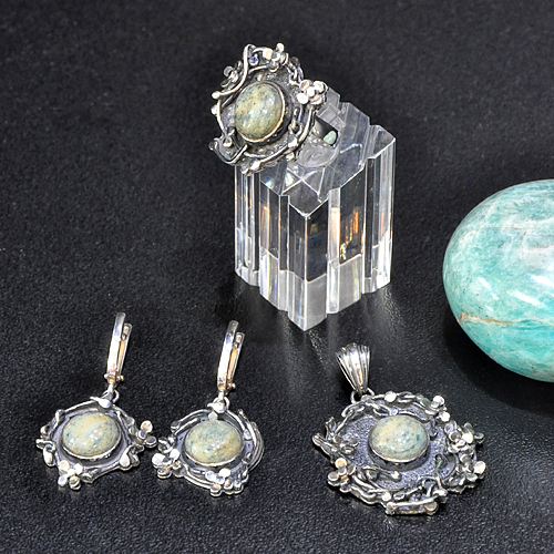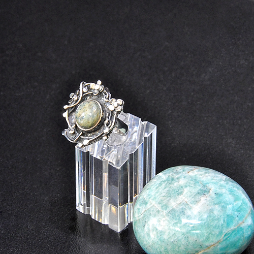 СРЕБЪРЕН ПРЪСТЕН С АВАНТЮРИН И ФЛОРАЛНИ МОТИВИ, РЪЧНА ИЗРАБОТКА.ГОЛЕМИНА НА ПРЪСТЕНА – 2.5/2.4 см.ДИАМЕТЪР НА КАМЪКА – 11 мм.РАЗМЕР НА ПРЪСТЕНА 54, КОРИГИРАЩА ХАЛКА.