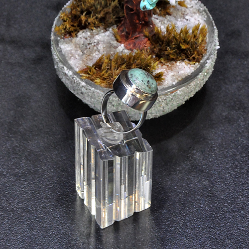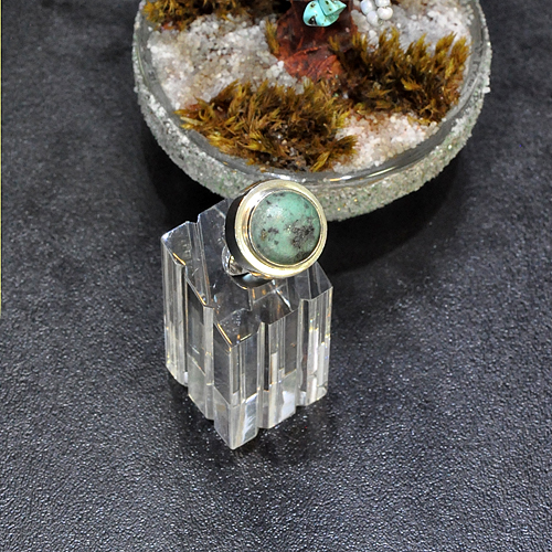 СРЕБЪРЕН ПРЪСТЕН В ОБЕМНА ФОРМА, С АФРИКАНСКИ ТЮРКОАЗ ЯСПИС, РЪЧНА ИЗРАБОТКА.ДИАМЕТЪР НА ПРЪСТЕНА – 1.8 см., ВИСОЧИНА – 1.1 см., ДИАМЕТЪР НА КАМЪКА 13 мм.РАЗМЕР НА ПРЪСТЕНА 53, КОРИГИРАЩА ХАЛКА.
