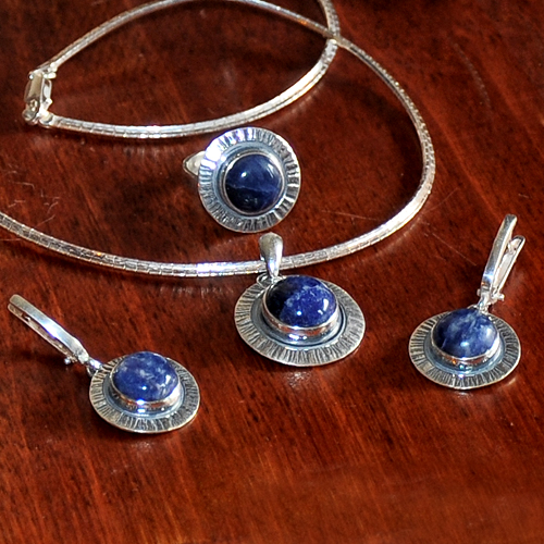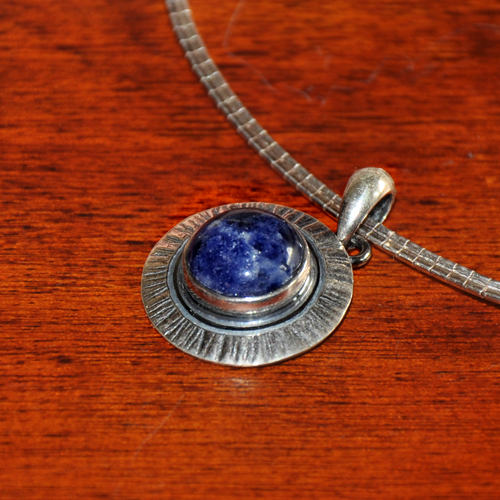СРЕБЪРЕН МЕДАЛЬОН СЪС СОДАЛИТ , РЪЧНА ИЗРАБОТКА.ГОЛЕМИНА НА КАМЪКА – 11 мм., ДИАМЕТЪРНА МЕДАЛЬОНА – 2.1 см.