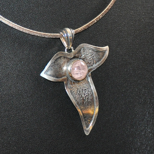 СРЕБЪРЕН МЕДАЛЬОН С РОЗОВ КВАРЦ , РЪЧНА ИЗРАБОТКА.ГОЛЕМИНА НА КАМЪКА – 9 мм., ГОЛЕМИНА НА МЕДАЛЬОНА –5.5/4.2 см.