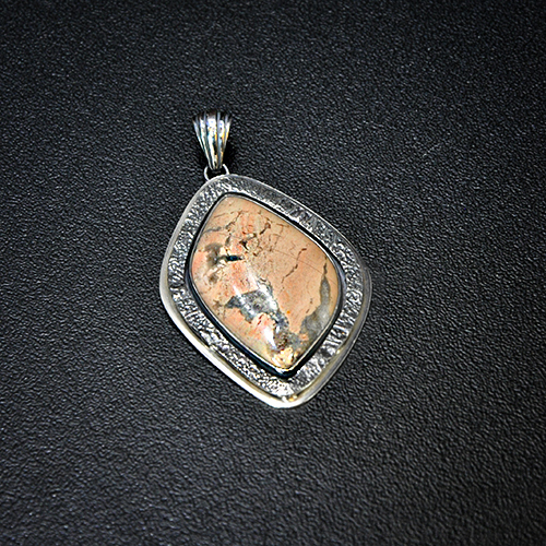 СРЕБЪРЕН МЕДАЛЬОН С ЯСПИС „БРЕКЧА“, РЪЧНА ИЗРАБОТКА.ГОЛЕМИНА НА КАМЪКА – 36/24 мм.,