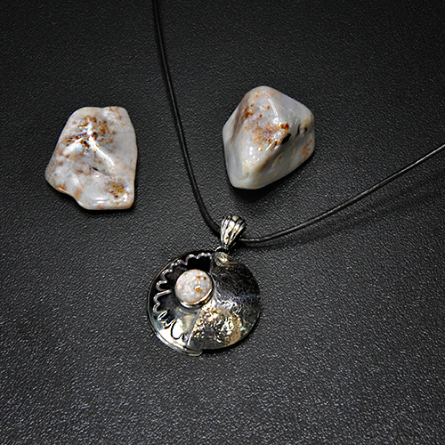 СРЕБЪРЕН МЕДАЛЬОН С АХАТ, РЪЧНА ИЗРАБОТКА.ДИАМЕТЪР НА КАМЪКА – 10 мм., ДИАМЕТЪР НА МЕДАЛЬОНА – 3.2 см.