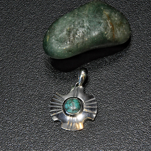 СРЕБЪРЕН МЕДАЛЬОН С АФРИКАНСКИ ТЮРКОАЗ, РЪЧНА ИЗРАБОТКА.ДИАМЕТЪР НА КАМЪКА – 7 мм., ДИАМЕТЪР НА МЕДАЛЬОНА – 2.2 см.
