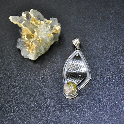 СРЕБЪРЕН МЕДАЛЬОН С КВАРЦ И ОКСИДИРАНО СРЕБРО, РЪЧНА ИЗРАБОТКА.ГОЛЕМИНА НА МЕДАЛЬОНА – 4.9/1.9 см., ДИАМЕТЪР НА КАМЪКА 11 мм.