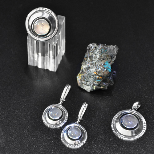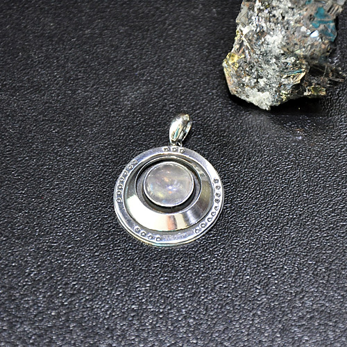 СРЕБЪРЕН МЕДАЛЬОН С РОЗОВ КВАРЦ, РЪЧНА ИЗРАБОТКА.ДИАМЕТЪР НА МЕДАЛЬОНА – 2.6 см., ДИАМЕТЪР НА КАМЪКА 11 мм.