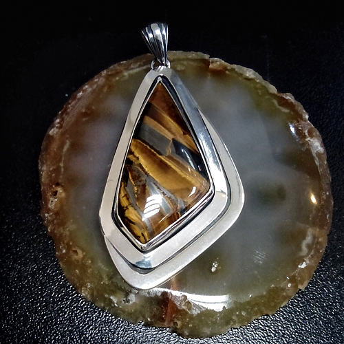 СРЕБЪРЕН МЕДАЛЬОН С КАМЪК ТИГРОВО ОКО С ХЕМАТИТ, РЪЧНА ИЗРАБОТКА.