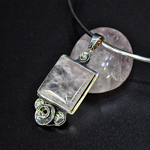 СРЕБЪРЕН МЕДАЛЬОН С РОЗОВ КВАРЦ, РЪЧНА ИЗРАБОТКА.ГОЛЕМИНА НА МЕДАЛЬОНА – 5.2/3.4 см., ГОЛЕМИНА НА КАМЪКА – 30/30 мм.