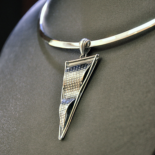 СРЕБЪРЕН МЕДАЛЬОН С ТРИЪГЪЛНА ФОРМА, РЪЧНА ИЗРАБОТКА.ГОЛЕМИНА НА МЕДАЛЬОНА –5.2/2.2 см.