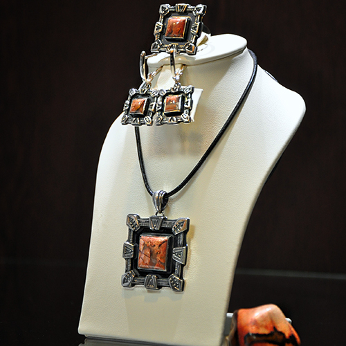 ОПИСАНИЕ: СРЕБЪРЕН КОМПЛЕКТ С ЯСПИС „БРЕКЧА“, СЪСТОЯЩ СЕ ОТ МЕДАЛЬОН, ПРЪСТЕН И ОБЕЦИ.