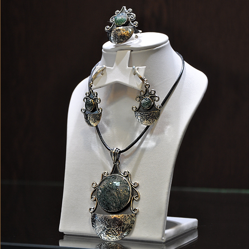 СРЕБЪРЕН КОМПЛЕКТ СЪС ЗЕЛЕН МЪХОВ АХАТ И АЖУРНИ МОТИВИ, РЪЧНА ИЗРАБОТКА, СЪСТОЯЩ СЕ ОТ МЕДАЛЬОН, ПРЪСТЕН И ОБЕЦИ.
