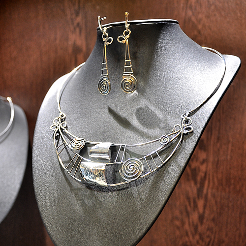 СРЕБЪРЕН КОМПЛЕКТ СЪС СПИРАЛОВИДНИ МОТИВИ, РЪЧНА ИЗРАБОТКА, СЪСТОЯЩ СЕ ОТ КОЛИЕ И ОБЕЦИ.