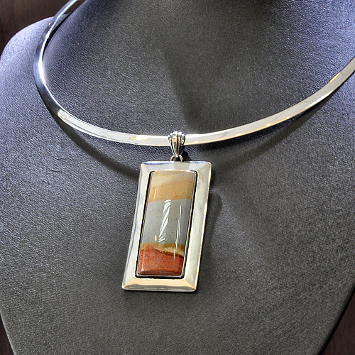 СРЕБЪРЕН КОМПЛЕКТ-УНИКАТ С ПОЛИХРОМ ЯСПИС „МАДАГАСКАР“ /ВИД ЯСПИС, СЪЧЕТАЛ НЯКОЛКО ЦВЯТА В ЕДИН КАМЪК/, РЪЧНА ИЗРАБОТКА, СЪСТОЯЩ СЕ ОТ МЕДАЛЬОН, ПРЪСТЕН И ОБЕЦИ.