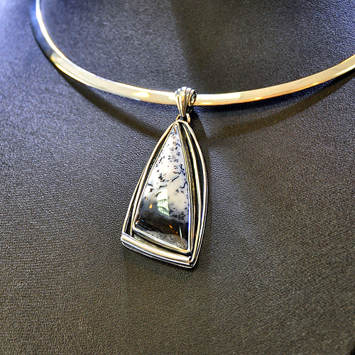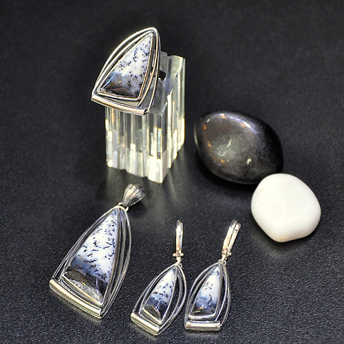 СРЕБЪРЕН КОМПЛЕКТ -УНИКАТ С ДЕНДРИТ ОПАЛ, РЪЧНА ИЗРАБОТКА, СЪСТОЯЩ СЕ ОТ МЕДАЛЬОН, ПРЪСТЕН И ОБЕЦИ.