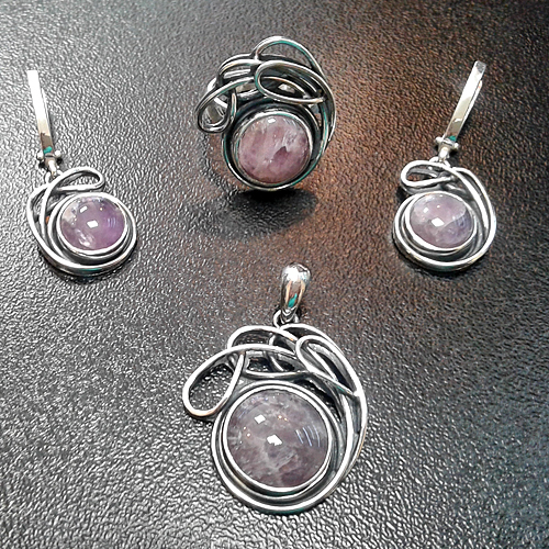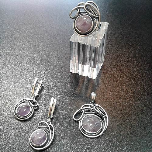 СРЕБЪРЕН КОМПЛЕКТ С АМЕТИСТ, РЪЧНА ИЗРАБОТКА, СЪСТОЯЩ СЕ ОТ МЕДАЛЬОН, ПРЪСТЕН И ОБЕЦИ.