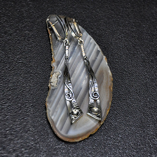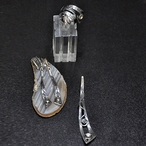 СРЕБЪРЕН КОМПЛЕКТ СЪС СПИРАЛОВИДНИ МОТИВИ, РЪЧНА ИЗРАБОТКА, СЪСТОЯЩ СЕ ОТ МЕДАЛЬОН, ПРЪСТЕН СПИРАЛА И ОБЕЦИ.