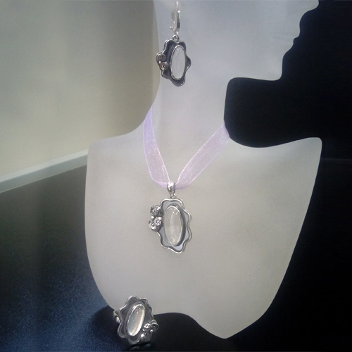СРЕБЪРЕН КОМПЛЕКТ С ПЛАНИНСКИ КРИСТАЛ С ФЛОРАЛНИ МОТИВИ, РЪЧНА ИЗРАБОТКА, СЪСТОЯЩ СЕ ОТ МЕДАЛЬОН, ПРЪСТЕН И ОБЕЦИ.