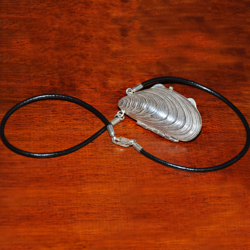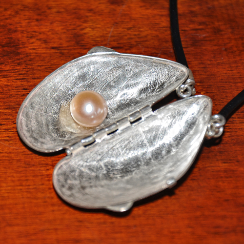 КОЛИЕ – СРЕБЪРНА МИДА С РЕЧНА ПЕРЛА и КОЖЕНА КАИШКА ОТ ЕСТЕСТВЕНА КОЖА СЪС СРЕБЪРНА ЗАКОПЧАЛКА, РЪЧНА ИЗРАБОТКА.ГОЛЕМИНА НА МИДАТА 5/2.5 см.